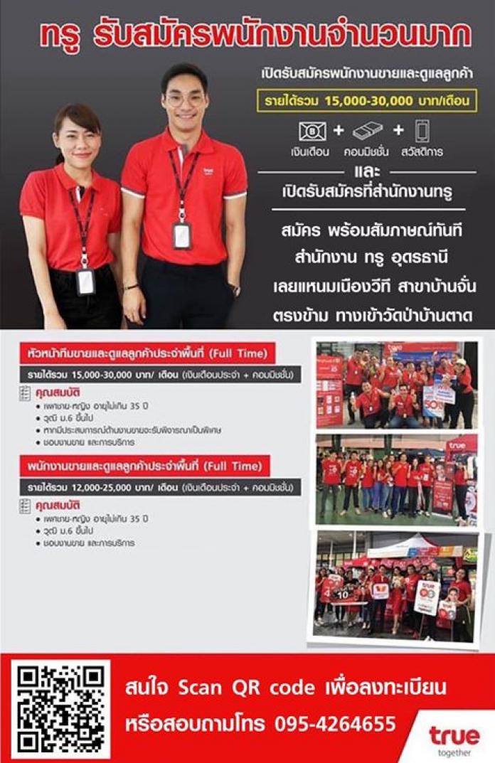 อุดรธานี: สมัครได้ที่อาคาร ซี.พี. แลนด์ ชั้น2(ตึกทรู) ถนนมะลิวัลย์ อ.เมือง จ.อุดรธานี