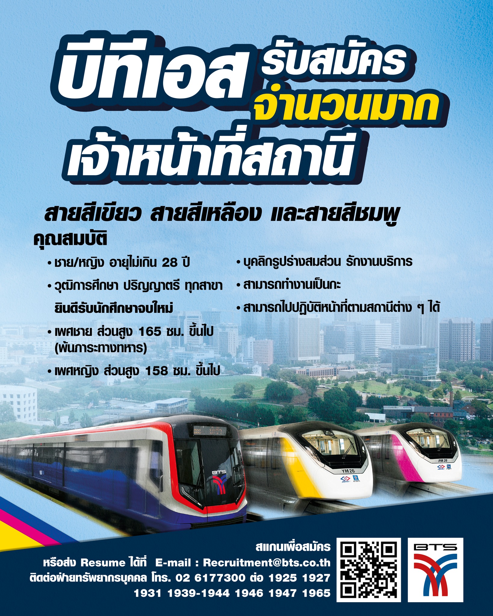 ติดตามข้อมูลข่าวสารการรับสมัครงาน เพิ่มเติม คลิก https://recruitment.bts.co.th/#/home