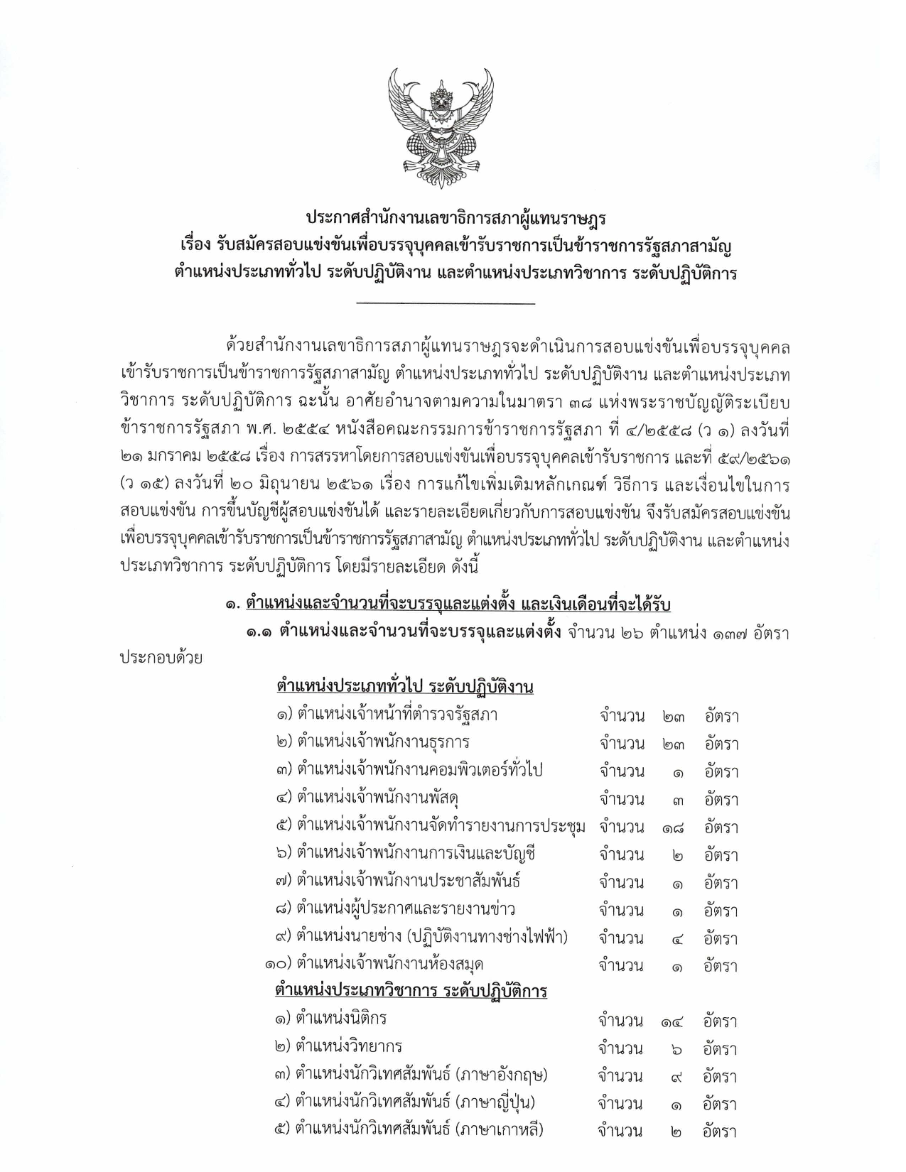 เรื่อง รับสมัครสอบแข่งขันเพื่อบรรจุบุคคลเข้ารับราชการเป็นข้าราชการรัฐสภาสามัญ ตำแหน่งประมาททั่วไป ระดับปฏิบัติงาน และทำแหน่งประประมาทวิชาการ ระดับปฏิบัติการด้วยสำนักงานเลขาธิการสภาผู้แทนราษฎรจะดำเนินการสอบแข่งขันเพื่อบรรจุบุคคลเข้ารับราชการเป็นข้าราชการรัฐสภาสามัญ ตำแหน่งประเภททั่วไป ระดับปฏิบัติงาน และตำแหน่งประเภท โดยรับสมัครตำแหน่งดังนี้