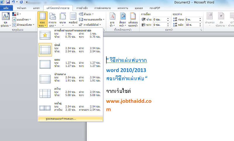 เรียนรู้วิธีทำแผ่นพับด้วยโปรแกรม Microsoft Word 2010 และ Microsoft Word 2013 ซึ่งทำโดยกระดาษขนาด A4 บอกเลยว่ามันไม่ได้ยาก แต่ก็ไม่ได้ง่ายอย่างที่หลายๆคนนั้นคิดเลยทีเดียว เพราะที่ผ่านมาผมเห็นหลายคนนำแผ่นพับมาปริ้นแต่สุดท้ายก็ไม่สำเร็จ เพราะการจัดหน้าเอกสารมานั้นผิดและมีการแบ่งหน้าที่ไม่ถูกต้อง วันนี้ทางทีมงาน Jobthaidd จะมาสอนให้ทุกท่านทำไปพร้อมๆกัน โดยมีขั้นตอนง่ายๆไม่ยุ่งยากอะไร