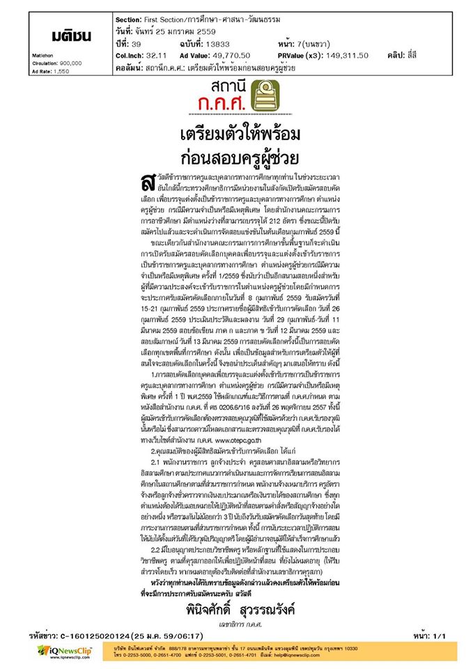 สถานี ก.ค.ศ. หนังสือพิมพ์มติชน ฉบับวันจันทร์ ที่ 25 มกราคม 2559 เรื่อง เตรียมตัวให้พร้อมก่อนสอบครูผู้ช่วย