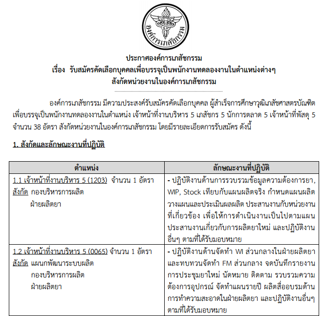 องค์การเภสัชกรรม มีความประสงค์รับสมัครคัดเลือกบุคคล ผู้สำเร็จการศึกษาวุฒิเภสัชศาสตรบัณฑิตเพื่อบรรจุเป็นพนักงานทดลองงานในตำแหน่ง เจ้าหน้าที่งานบริหาร 5 เภสัชกร 5 นักการตลาด 5 เจ้าหน้าที่พัสดุ 5 จำนวน 38 อัตรา สังกัดหน่วยงานในองค์การเภสัชกรรม โดยมีรายละเอียดการรับสมัคร ดังนี้