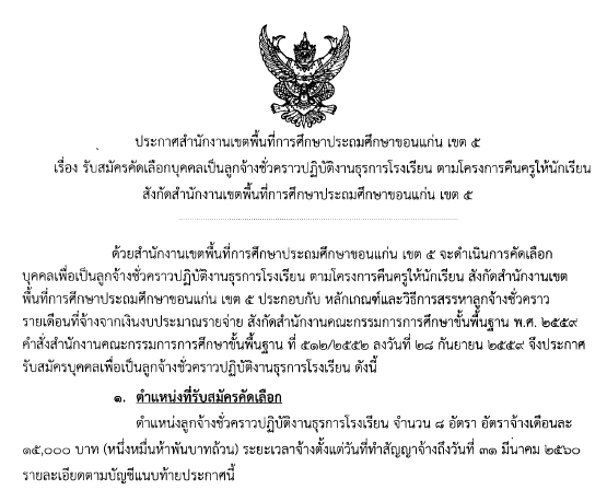 รับสมัครคัดเลือกบุคคลเป็นลูกจ้างชั่วคราวปฏิบัติงานธุรการโรงเรียน ตามโครงการคืนครูให้นักเรียน สังกัดสำนักงานเขตพื้นที่การศึกษาประถมศึกษาขอนแก่น เขต 5