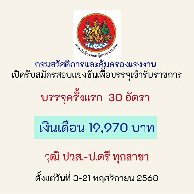 กรมสวัสดิการและคุ้มครองแรงงาน เปิดรับสมัครสอบบรรจุเข้ารับราชการ 30 อัตรา