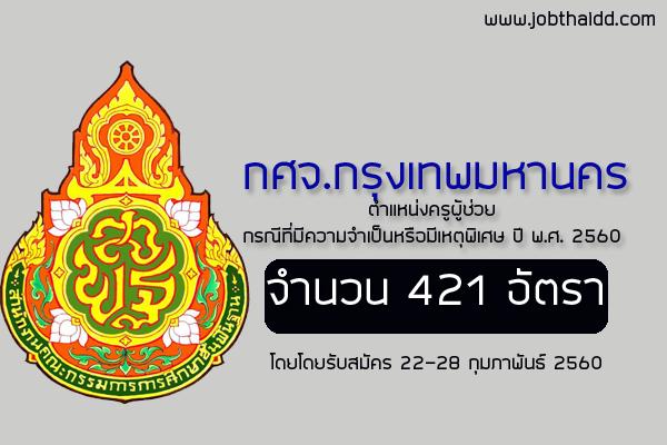 ล่าสุด กศจ.กรุงเทพมหานคร เปิดสอบครูผู้ช่วย กรณีพิเศษ 421 อัตรา เปิดรับสมัคร 22-28 ก.พ. 60 ประกาศคณะกรรมการศึกษาธิการจังหวัดกรุงเทพมหานคร เรื่อง รับสมัครสอบคัดเลือกเพื่อบรรจุและแต่งตั้งบุคคลเข้ารับราชการเป็นข้าราชการครูและบุคลากรทางการศึกษา ตำแหน่งครูผู้ช่วย กรณีที่มีความจำเป็นหรือมีเหตุพิเศษ ปี พ.ศ. 2560 สำนักงานศึกษาธิการจังหวัดกรุงเทพมหานคร สังกัดสำนักงานคณะกรรมการการศึกษาขั้นพื้นฐาน โดยรับสมัครจำนวนทั้งสิ้น 421 อัตรา