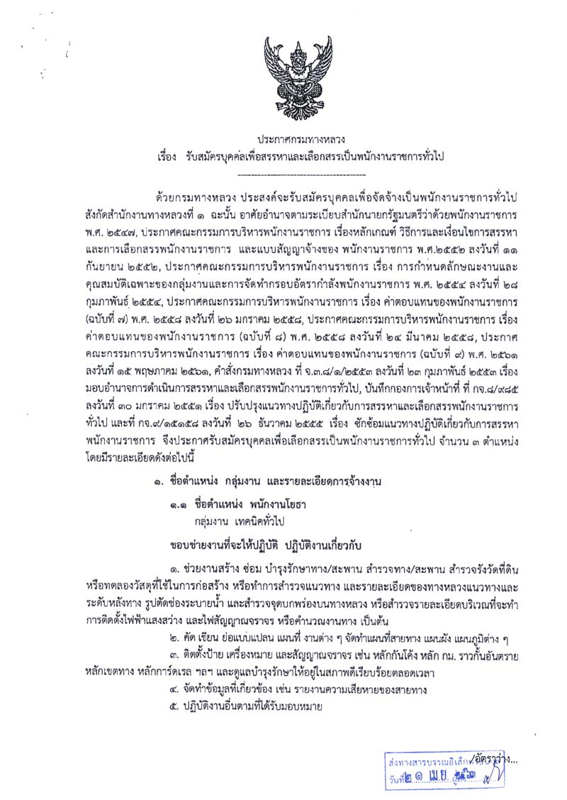 สำนักงานทางหลวงที่ 1 รับสมัครบุคคลเพื่อสรรหาและเลือกสรรเป็นพนักงานราชการ 16 อัตรา
