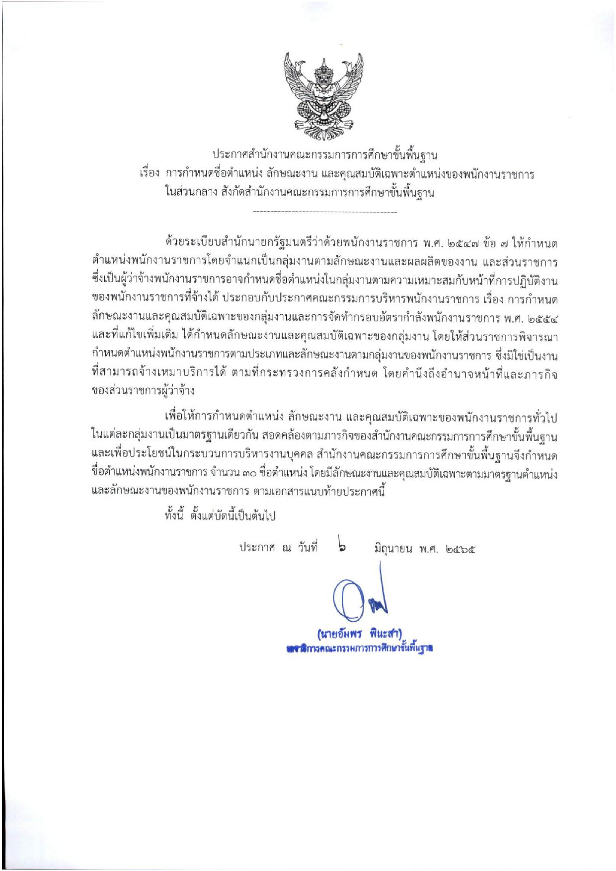 ประกาศ สพฐ. เรื่องการกำหนดชื่อตำแหน่ง ลักษณะงาน และคุณสมบัติเฉพาะตำแหน่งของพนักงานราชการในส่วนกลาง สังกัด สพฐ.