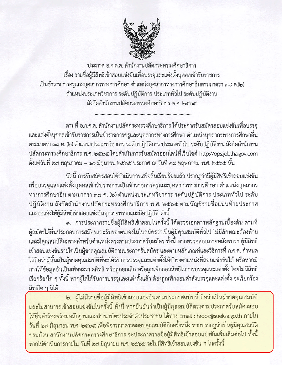 ให้ยื่นคำร้องพร้อมหลักฐานและสำเนาบัตรประจำตัวประชาชน ได้ทาง Email : hrops@sueksa.go.th ภายในวันที่ 27 มิถุนายน พ.ศ. 2565 เพื่อพิจารณาตรวจสอบคุณสมบัติอีกครั้งหนึ่ง หากปรากฎว่าเป็นผู้มีคุณสมบัติครบถ้วน สำนักงานปลัดกระทรวงศึกษาธิการ จะประกาศรายชื่อผู้มีสิทธิเข้าสอบแข่งขันเพิ่มเติมต่อไป ทั้งนี้หากไม่ดำเนินการภายใน วันที่ 27 มิถุนายน พ.ศ. 2565 จะไม่มีสิทธิเข้าสอบแข่งขัน ฯ ในครั้งนี้