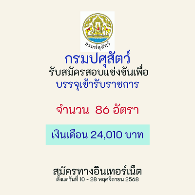 กรมปศุสัตว์ รับสมัครสอบแข่งขันเพื่อบรรจุและแต่งตั้งบุคคลเข้ารับราชการ 86 อัตรา