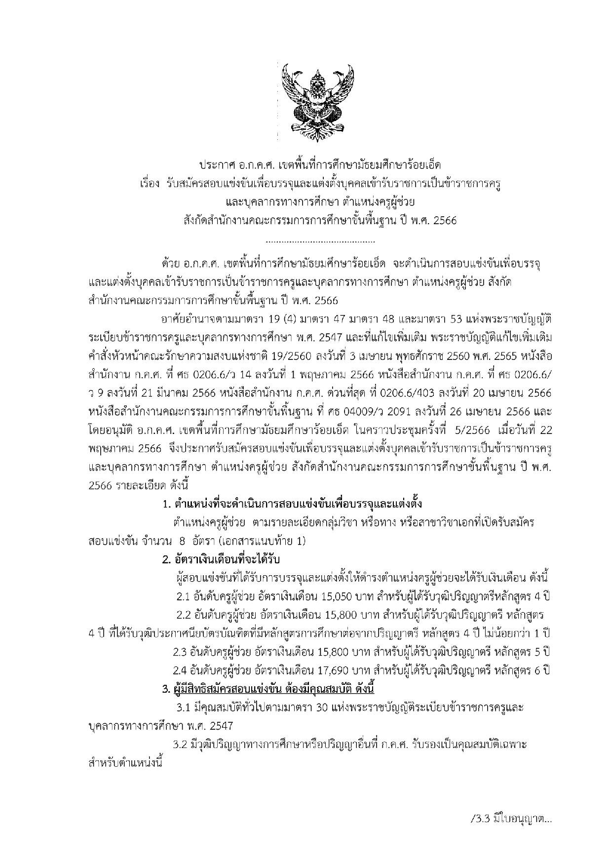 เรื่อง รับสมัครสอบแข่งขันเพื่อบรรจุและแต่งตั้งบุคคลเข้ารับราชการเป็นข้าราชการครูและบุคลากรทางการศึกษา ตำแหน่งครูผู้ช่วย สังกัด สำนักงานคณะกรรมการการศึกษาขั้นพื้นฐาน ปี พ.ศ.2566ด้วย อ.ก.ค.ศ. เขตพื้นที่การศึกษามัธยมศึกษาร้อยเอ็ด จะดำเนินการสอบแข่งขันเพื่อบรรจุ