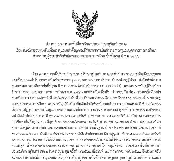 เรื่อง รับสมัครสอบแข่งขันเพื่อบรรจุและแต่งตั้งบุคคลเข้ารับราชการเป็นข้าราชการครูและบุคลากรทางการศึกษา ตำแหน่งครูผู้ช่วย สังกัด สำนักงานคณะกรรมการการศึกษาขั้นพื้นฐาน ปี พ.ศ.2566ด้วย อ.ก.ค.ศ. เขตพื้นที่การศึกษาประถมศึกษาสุรินทร์ เขต 2 จะดำเนินการสอบแข่งขันเพื่อบรรจุและแต่งตั้งบุคคลเข้ารับราชการเป็นข้าราชการครูและบุคลากรทางการศึกษา ตำแหน่งครูผู้ช่วย สังกัดสำนักงานคณะกรรมการการศึกษาขั้นพื้นฐาน ปี พ.ศ. 2566