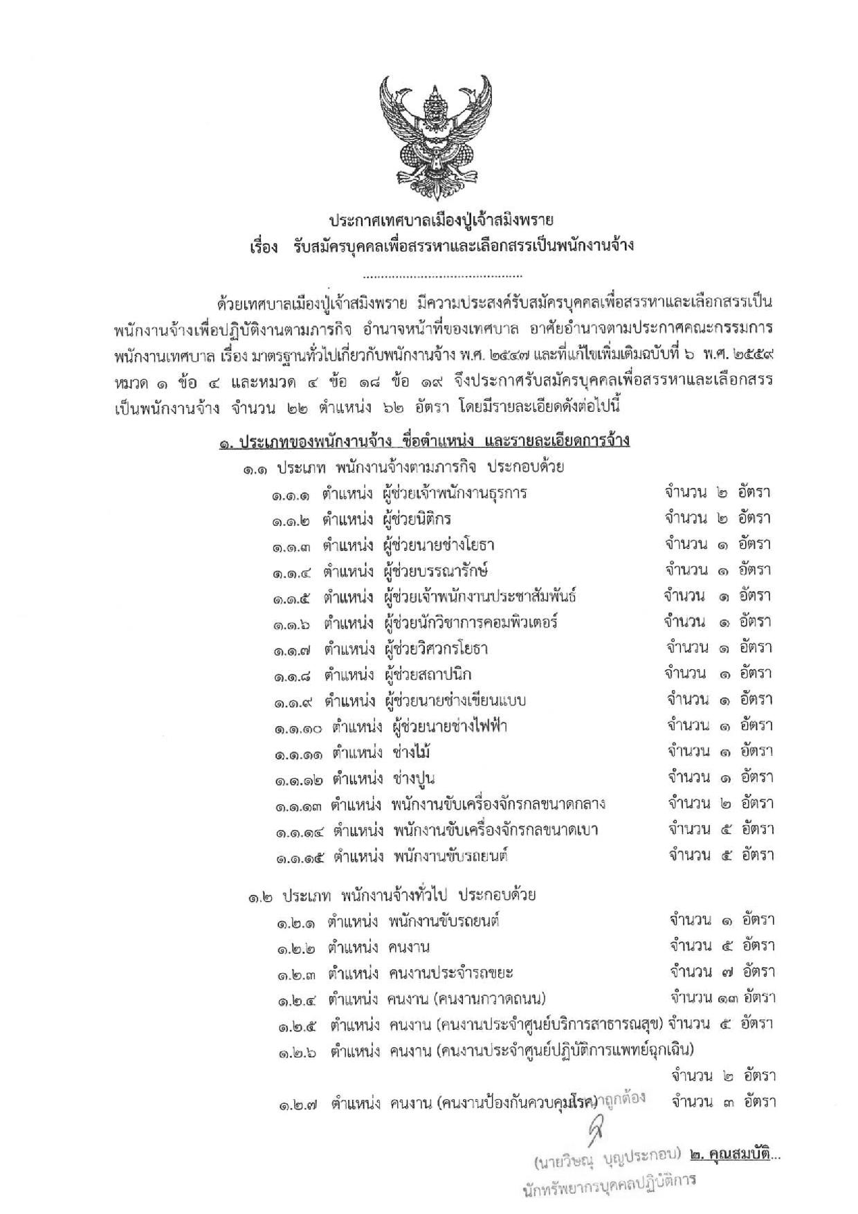 เพื่อปฏิบัติงานตามภารกิจ อำนาจหน้าที่ของเทศบาล จำนวน 22 ตำแหน่ง 62 อัตรา โดยสามารถติดต่อขอรับใบสมัครและยื่นใบสมัครได้ที่ อาคารสำนักงานเทศบาลเมืองปู่เจ้าสมิงพราย