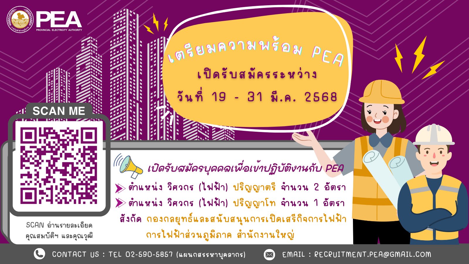 รับสมัครทางอินเตอร์เน็ตได้ที่เว็บไซต์ https://www.pea.co.th/ หัวข้อ “ข่าวรับสมัครงาน” ตั้งแต่วันที่ 19 – 31 มีนาคม 2568 สอบถามเพิ่มเติมโทร (02)590-5857 (เวลาทำการ 08.30 – 16.30 น. Email : recruit@pea.co.th
