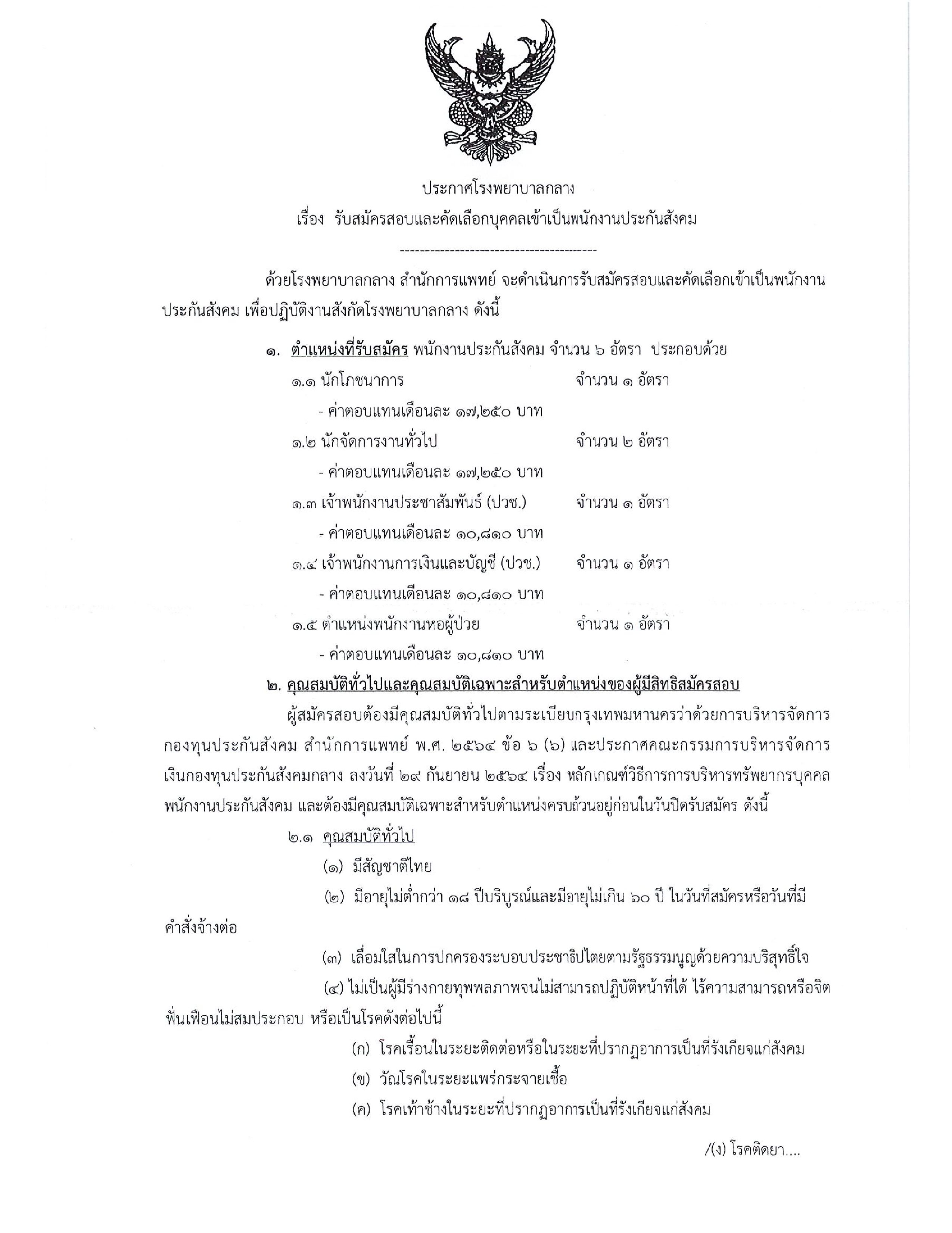 โรงพยาบาลกลาง รับสมัครสอบและคัดเลือกบุคคลเข้าเป็นพนักงานประกันสังคม 6 อัตรา