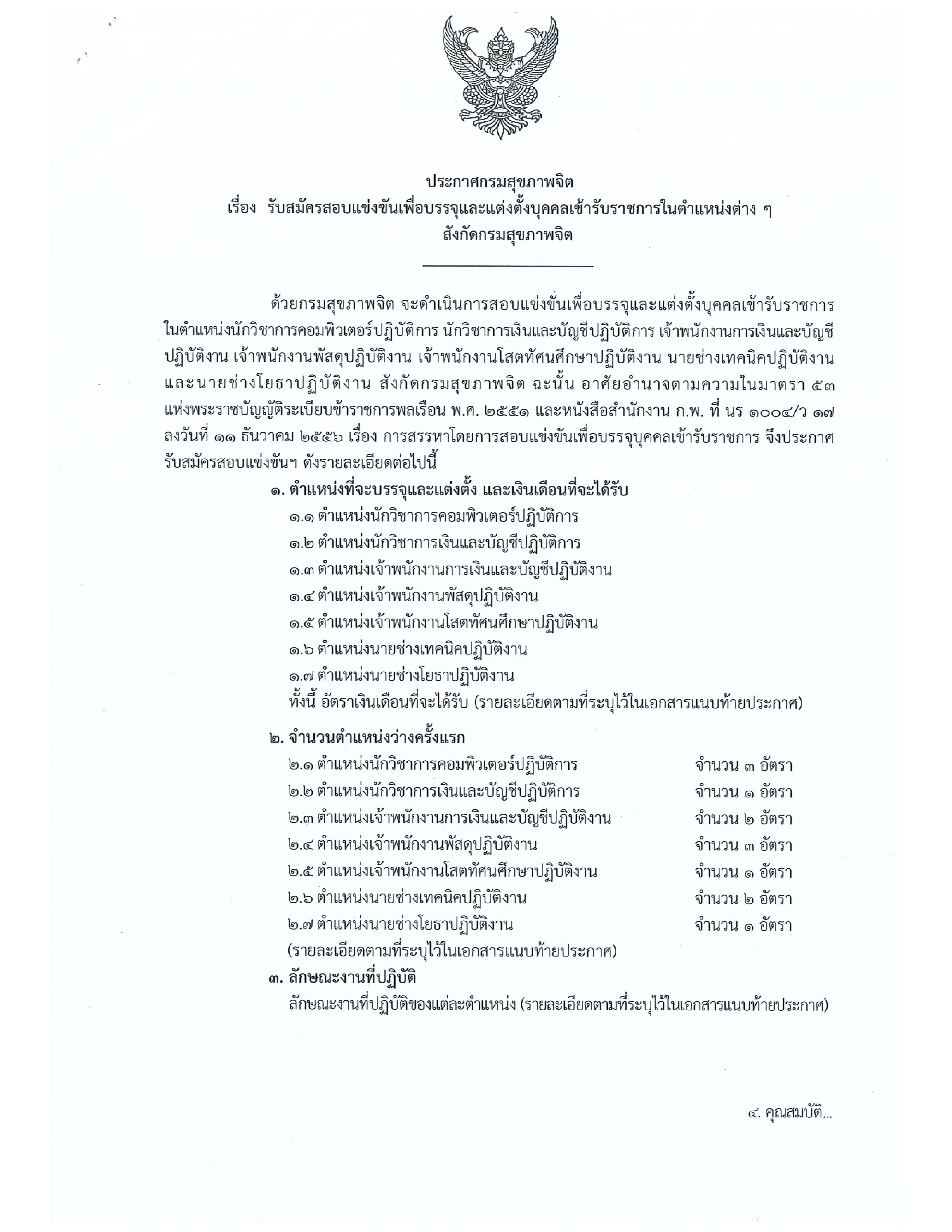 เรื่อง รับสมัครสอบแข่งขันเพื่อบรรจุและแต่งตั้งบุคคลเข้ารับราชการในตำแหน่งต่าง ๆ สังกัดกรมสุขภาพจิตด้วยกรมสุขภาพจิต จะดำเนินการสอบแข่งขันเพื่อบรรจุและแต่งตั้งบุคคลเข้ารับราชการ ในตำแหน่งต่างๆดังนี้