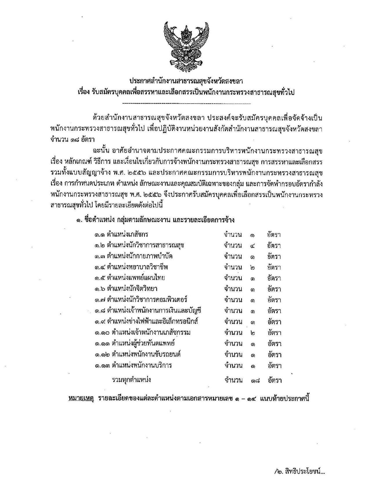 เรื่อง รับสมัครบุคคลเพื่อสรรหาและเลือกสรรเป็นพนักงานกระทรวงสาธารณสุขทั่วไปด้วยสำนักงานสาธารณสุขจังหวัดสงขลา ประสงค์จะรับสมัครบุคคลเพื่อจัดจ้างเป็นพนักงานกระทรวงสาธารณสุขทั่วไป เพื่อปฏิบัติงานหน่วยงานสังกัดสำนักงานสาธารณสุขจังหวัดสงขลา