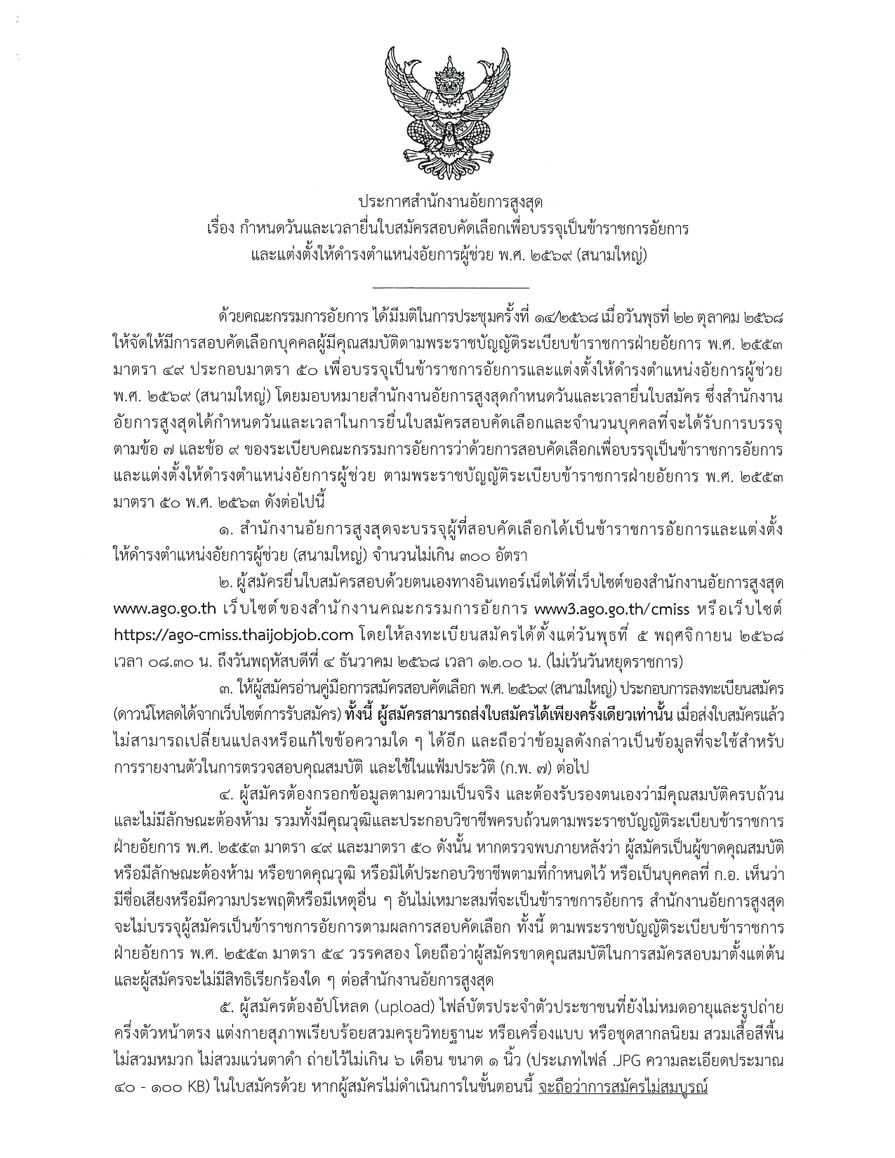 เรื่อง กำหนดวันและเวลายื่นใบสมัครสอบคัดเลือกเพื่อบรรจุเป็นข้าราชการอัยการและแต่งตั้งให้ดำรงตำแหน่งอัยการผู้ช่วย พ.ศ. 2569 (สนามใหญ่)ด้วยคณะกรรมการอัยการ ได้มีมติในการประชุมครั้งที่ 14/2568 เมื่อวันพุธที่ 22 ตุลาคม 2568 ให้จัดให้มีการสอบคัดเลือกบุคคลผู้มีคุณสมบัติตามพระราชบัญญัติระเบียบข้าราชการฝ่ายอัยการ พ.ศ. 2553 มาตรา 49 ประกอบมาตรา 50 เพื่อบรรจุเป็นข้าราชการอัยการและแต่งตั้งให้ดำรงตำแหน่งอัยการผู้ช่วยพ.ศ. 2568 (สนามใหญ่) โดยมอบหมายสำนักงานอัยการสูงสุดกำหนดวันและเวลายื่นใบสมัคร ซึ่งสำนักงาน อัยการสูงสุดได้กำหนดวันและเวลาในการยื่นใบสมัครสอบคัดเลือกและจำนวนบุคคลที่จะได้รับการบรรจุ ตามข้อ 7 และข้อ 9 ของระเบียบคณะกรรมการอัยการว่าด้วยการสอบคัดเลือกเพื่อบรรจุเป็นข้าราชการอัยการ และแต่งตั้งให้ดำรงตำแหน่งอัยการผู้ช่วย ตามพระระราชบัญญัติระเบียบข้าราชการฝ่ายอัยการ พ.ศ. 2553 มาตรา 50 พ.ศ. 2563 ดังต่อไปนี้