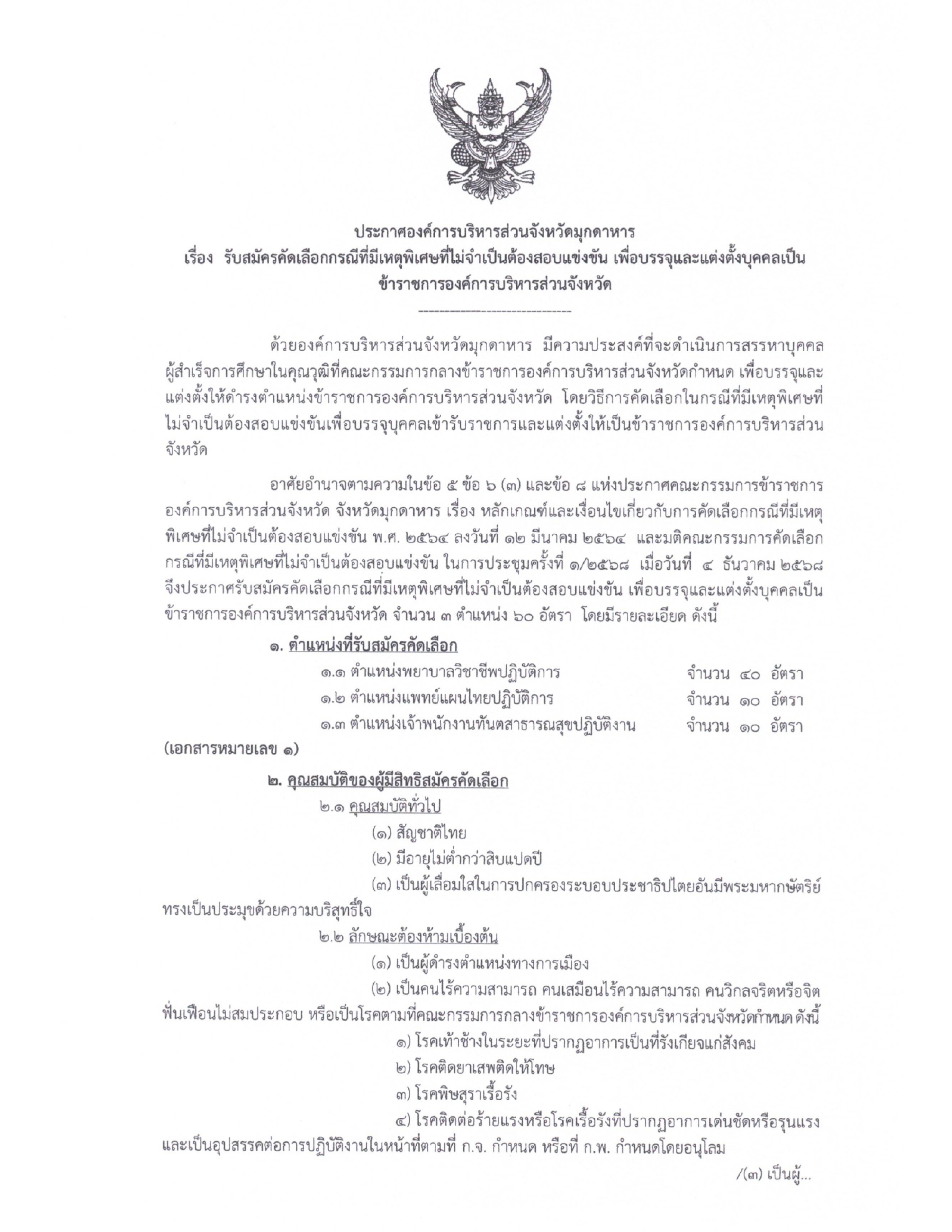 ประกาศองค์การบริหารส่วนจังหวัดมุกดาหารเรื่อง รับสมัครคัดเลือกกรณีที่มีเหตุพิเศษที่ไม่จำเป็นต้องสอบแข่งขัน เพื่อบรรจุและแต่งตั้งบุคคลเป็นข้าราชการองค์การบริหารส่วนจังหวัด