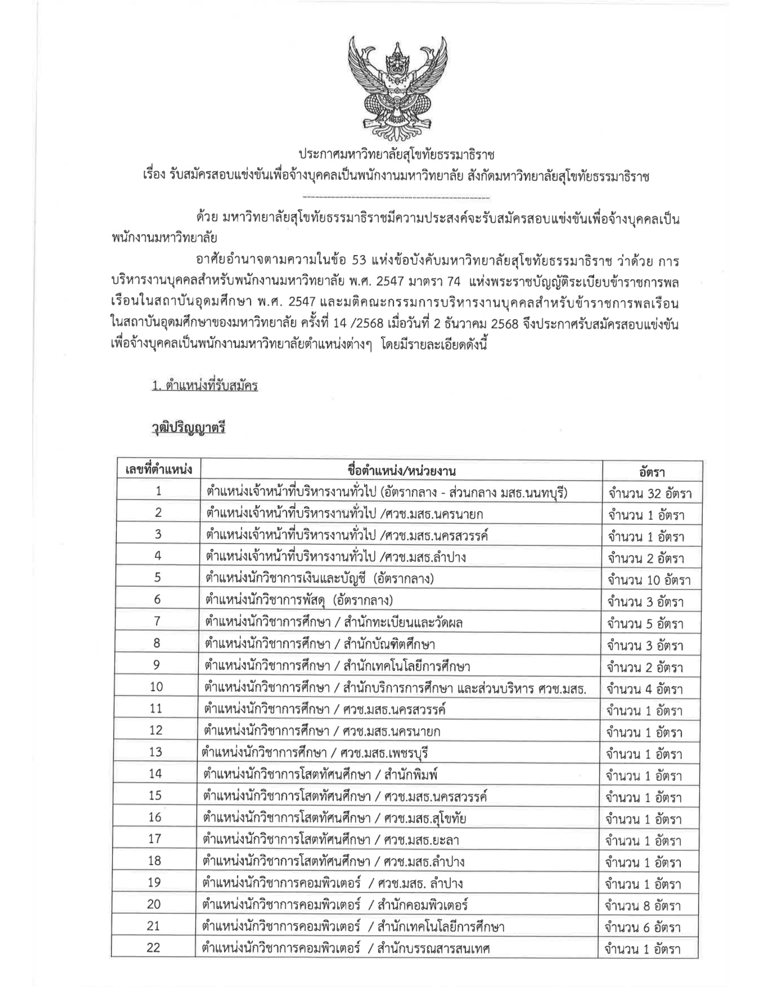 ประกาศมหาวิทยาลัยสุโขทัยธรรมาธิราช เรื่อง รับสมัครสอบแข่งขันเพื่อจ้างบุคคลเป็นพนักงานมหาวิทยาลัย สังกัดมหาวิทยาลัยสุโขทัยธรรมาธิราช