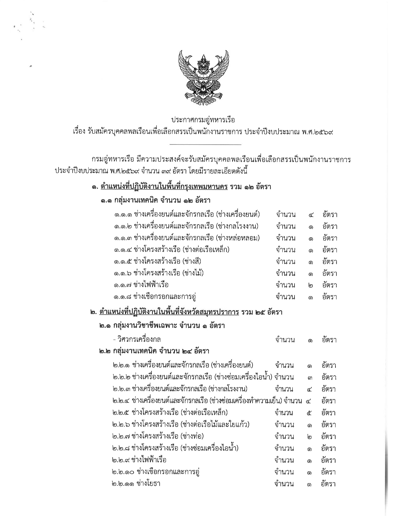 เรื่อง รับสมัครบุคคลพลเรือนเพื่อเลือกสรรเป็นพนักงานราชการ ประจำปีงบประมาณ พ.ศ. 2569กรมอู่ทหารเรือ มีความประสงค์จะรับสมัครบุคคลพลเรือนเพื่อเลือกสรรเป็นพนักงานราชการ