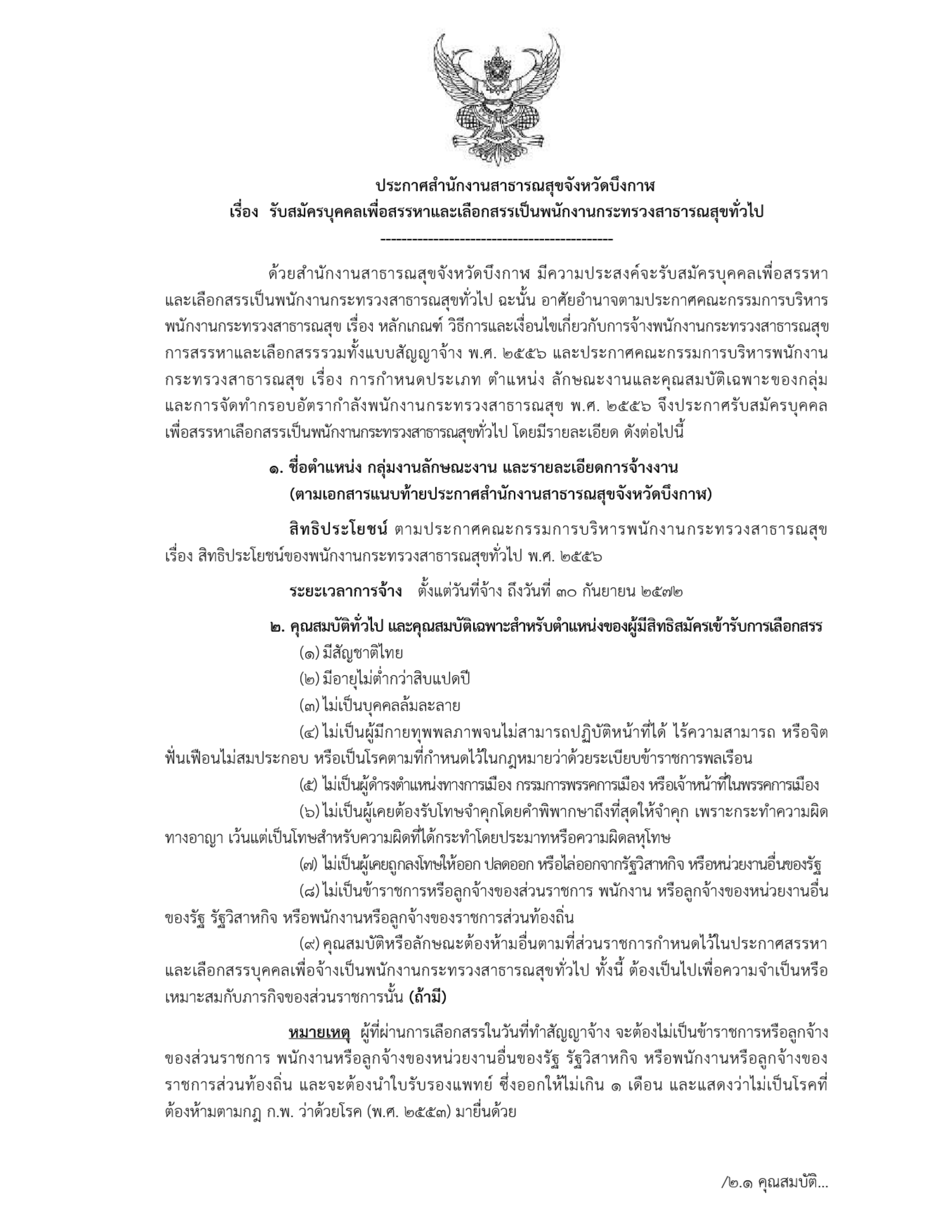 เรื่อง รับสมัครบุคคลเพื่อสรรหาและเลือกสรรเป็นพนักงานกระทรวงสาธารณสุขทั่วไปด้วยสำนักงานสาธารณสุขจังหวัดบึงกาฬ มีความประสงค์จะรับสมัครบุคคลเพื่อสรรหาและเลือกสรรเป็นพนักงานกระทรวงสาธารณสุขทั่วไป