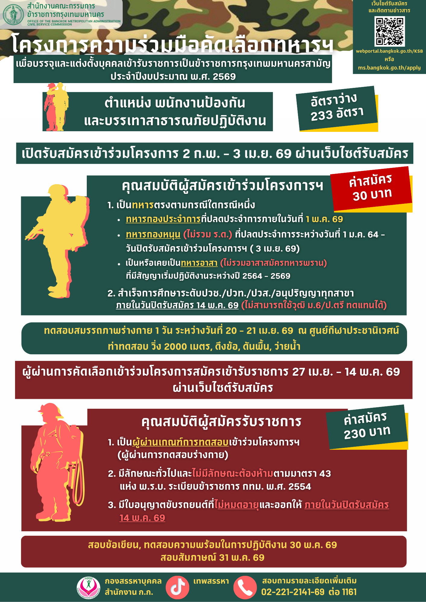 สำนักงาน ก.ก. รับสมัครคัดเลือกทหารกองประจำการ ทหารกองหนุน และทหารอาสาฯ เพื่อบรรจุเข้ารับราชการ 233 อัตรา สมัครทางอินเทอร์เน็ต ตั้งแต่วันที่ 2 กุมภาพันธ์ - 3 เมษายน 2569ประกาศสำนักงานคณะกรรมการข้าราชการกรุงเทพมหานคร