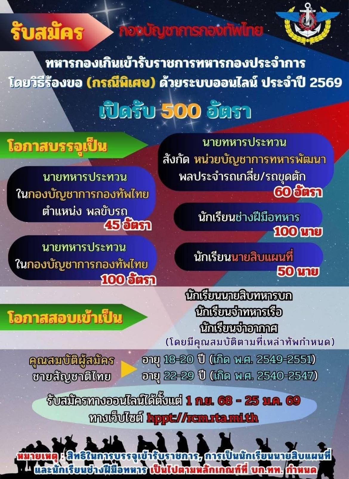 รับสมัครทางอินเตอร์เน็ตได้ที่เว็บไซต์ https://rcm.rta.mi.th/index69.php ตั้งแต่วันที่ 1 กันยายน 2568 – 25 มกราคม 2569