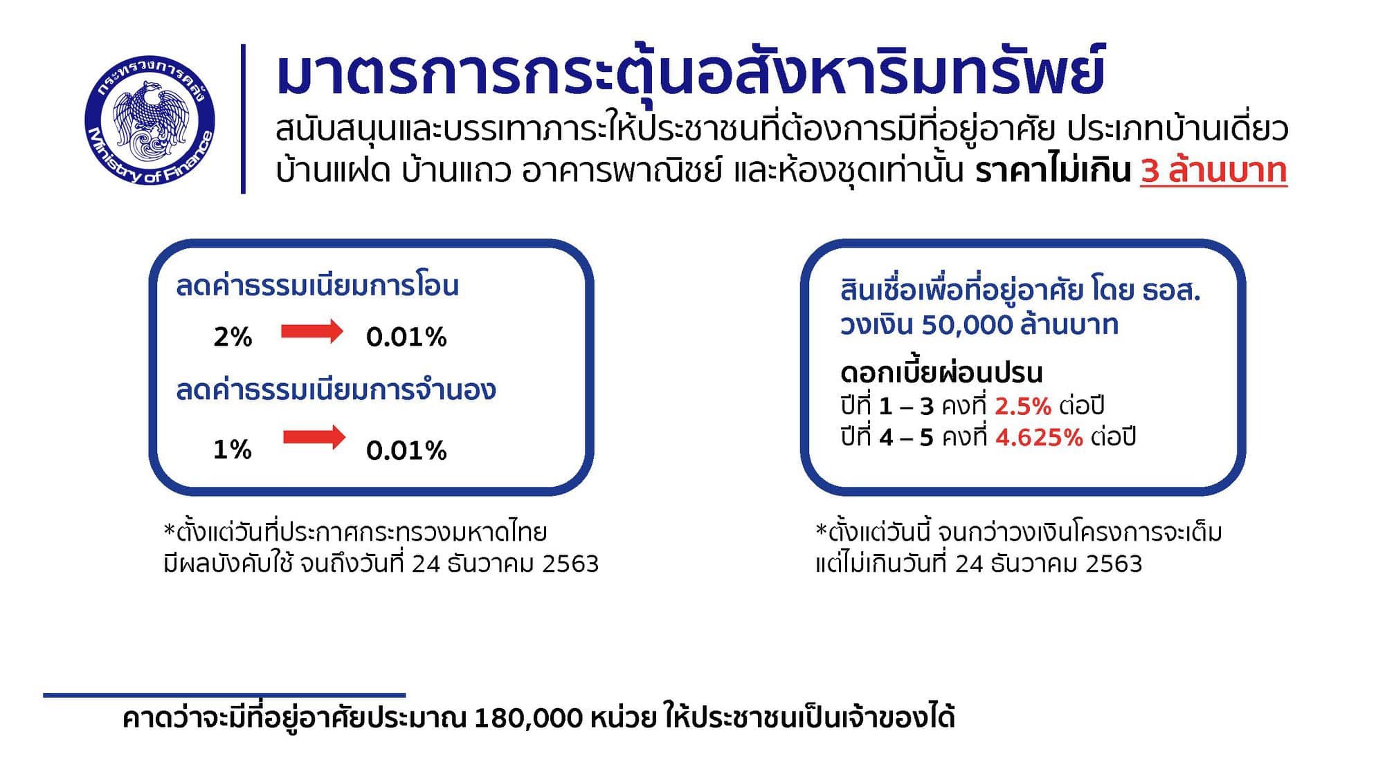 ทั้งนี้ เฉพาะการซื้อขายที่อยู่อาศัยที่ดินพร้อมอาคารหรือห้องชุด ในราคาไม่เกิน 3 ล้านบาทต่อหน่วยและการจดทะเบียนการโอน และการจดจำนองอสังหาริมทรัพย์ ซึ่งเป็นที่อยู่อาศัยต้องดำเนินการในคราวเดียวกัน โดยมีระยะเวลานับตั้งแต่วันที่ประกาศกระทรวงมหาดไทยมีผลบังคับใช้ถึงวันที่ 24 ธันวามคม 2563