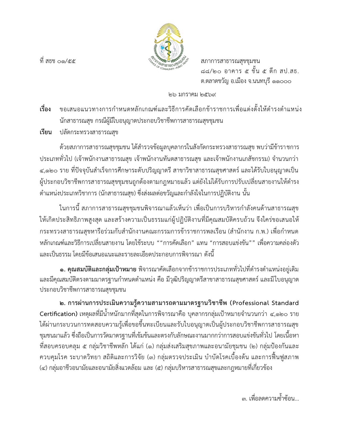 ในหนังสือดังกล่าว ระบุว่า สภาการสาธารณสุขชุมชน ได้สำรวจข้อมูลบุคลากรในสังกัดกระทรวงสาธารณสุข (สธ.) พบว่ามีข้าราชการประเภททั่วไป (เจ้าพนักงานสาธารณสุข เจ้าพนักงานทันตสาธารณสุข และเจ้าพนักงานเภสัชกรรม) จำนวนกว่า 4,120 คน ที่ปัจจุบันสำเร็จการศึกษาระดับปริญญาตรี สาขาวิชาสาธารณสุขศาสตร์ และได้รับใบอนุญาตเป็น ผู้ประกอบวิชาชีพการสาธารณสุขชุมชนถูกต้องตามกฎหมายแล้ว แต่ยังไม่ได้รับการปรับเปลี่ยนสายงานให้ดำรง ตำแหน่งประเภทวิชาการ (นักสาธารณสุข) ซึ่งส่งผลต่อขวัญและกำลังใจในการปฏิบัติงาน